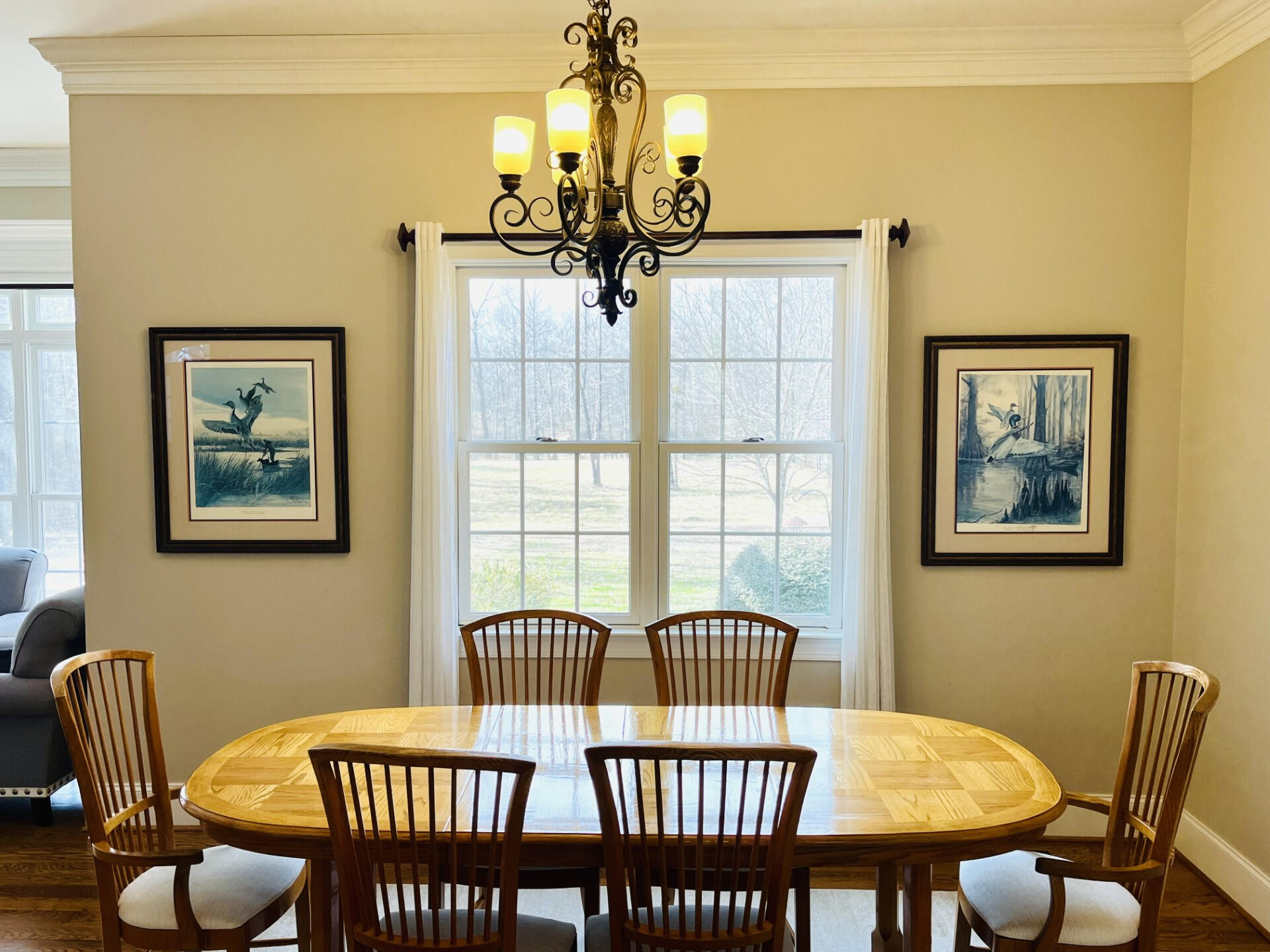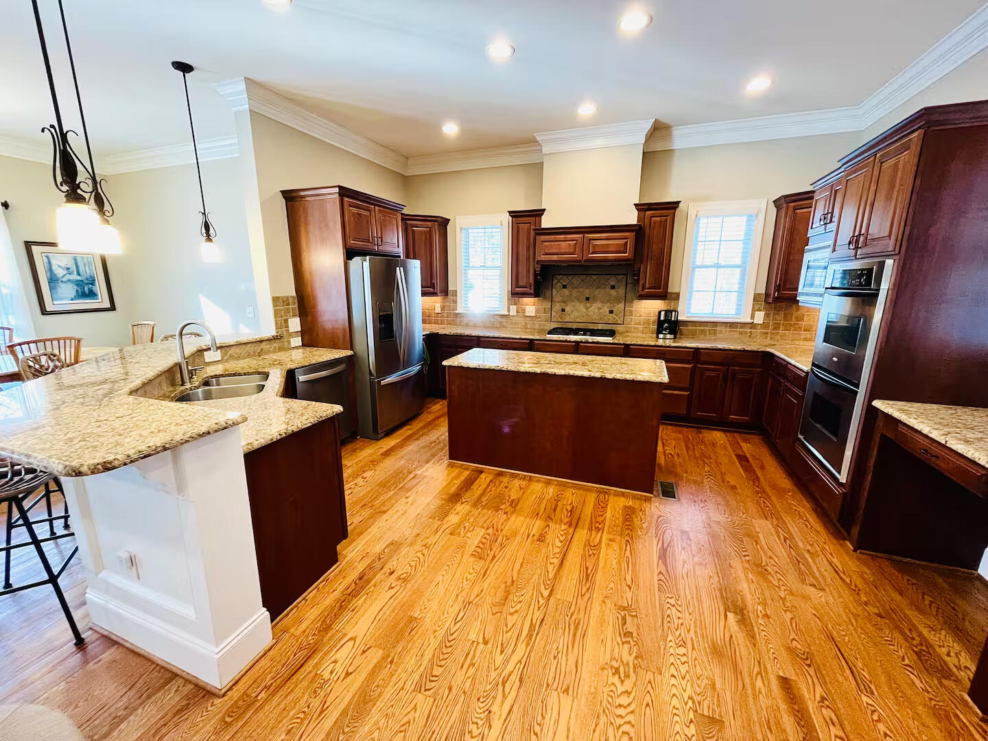 • Dining Area: An large table that is perfect for shared meals with views of the property. Additional seating is available at the kitchen island.Kitchen